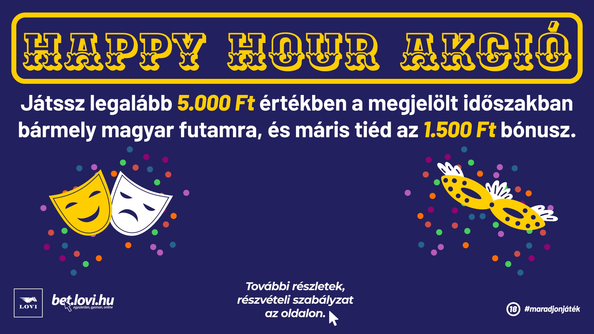 A nyereményjátékban azok a fogadók vesznek részt, akik a meghirdetett Happy Hour időszakban, magyar futamokra legalább 5.000 Forint összértékben kötnek fogadást, egy vagy több szelvényen a bet.lovi.hu felületén. A megjátszott tikettek össszevonásra kerülnek.