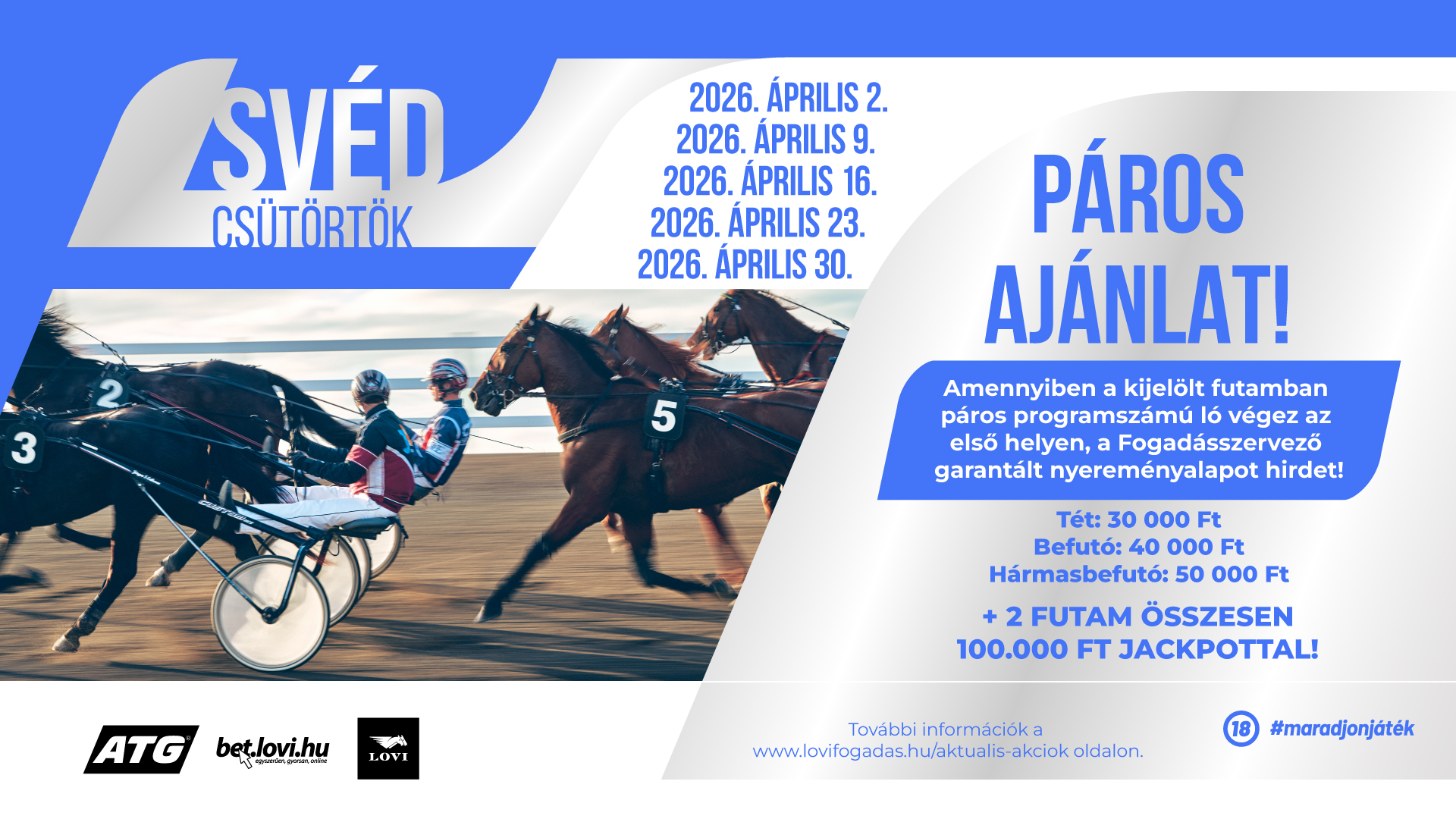 – a játék időtartamában a hazai nyereményalapban szervezett, erre kijelölt svéd ügető futamokban leadott TÉT, BEFUTÓ, HÁRMASBEFUTÓ fogadásokkal lehet részt venni az akcióban.